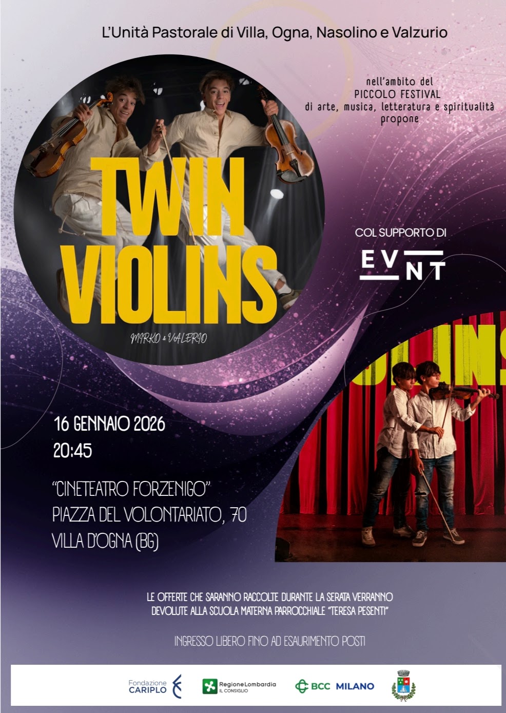 Comincia con il concerto dei “Twin Violins”, venerdì 16 gennaio a Villa d’Ogna, il “Piccolo Festival di musica, arte, letteratura e spiritualità” organizzato dall’Unità Pastorale di Villa, Ogna, Nasolino e Valzurio. Una iniziativa che nasce dall’esigenza di creare, all’interno della comunità, momenti di aggregazione e di approfondimento culturale. Spiega il parroco, don Mattia Ranza: “Paesi come Villa d’Ogna, in alta Valle Seriana, patiscono, anche dal punto di vista culturale, un notevole isolamento rispetto al capoluogo Bergamo e la Parrocchia rappresenta, per molti, non solo un riferimento spirituale, ma anche culturale, educativo e sociale. I nuovi luoghi dell’educazione e della cultura sono oggi anche le Parrocchie e gli oratori, che affiancano e coordinano la propria attività con quella di altre istituzioni come le scuole, le biblioteche e, nei centri più grandi, i cinema e i teatri”.