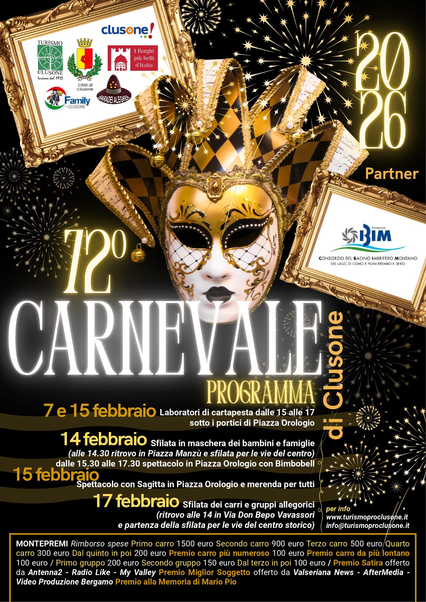 La Pro Clusone ha iniziato con lo svelare la locandina della prossima edizione del Carnevale Clusonese. Si tratterà del concorso per carri allegorici numero 72, cifra che dà l’idea della tradizione e del legame baradello con questo appuntamento. L’evento sarà in collaborazione con il Comune di Clusone e ha come partner il Bim del Serio, per la precisione il Consorzio del Bacino imbrifero montano del Lago di Como e fiumi Brembo e Serio.