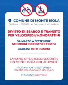 La disposizione è stata rilanciata in queste ore anche dalla società Navigazione lago d’Iseo per sottolineare che «nei giorni citati e per le sole tratte verso Monte Isola verrà sospesa la vendita dei biglietti ‘Bicicletta’”. Si puntualizza però che il divieto non è applicato alle bici e ai monopattini condotti da residenti nel Comune di Monte Isola, oppure di mezzi già presenti sul territorio o sbarcati nei giorni non soggetti al divieto. È il caso, per esempio, di bici o monopattini a noleggio o che appartengono a proprietari di seconde case, mezzi di hotel e residence concessi in uso ai clienti. Sono esclusi dal provvedimento le persone con ridotta capacità di deambulazione.
